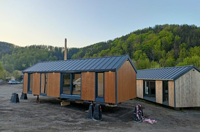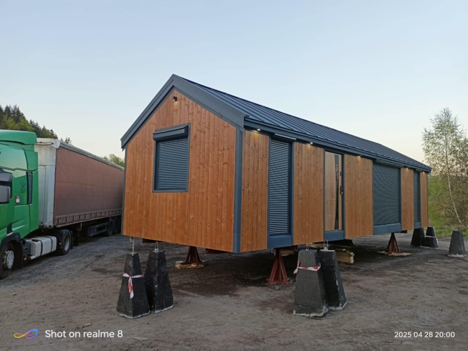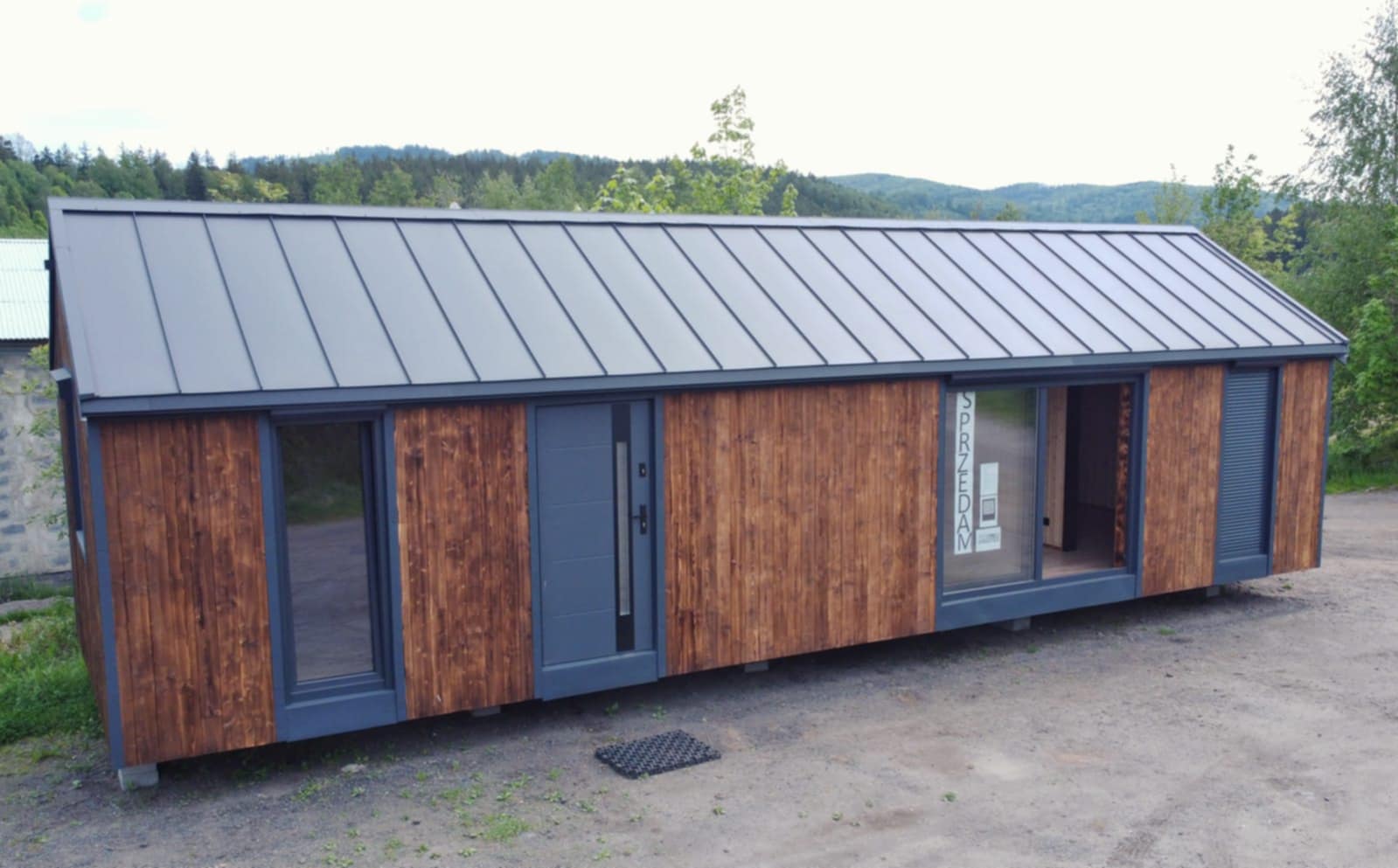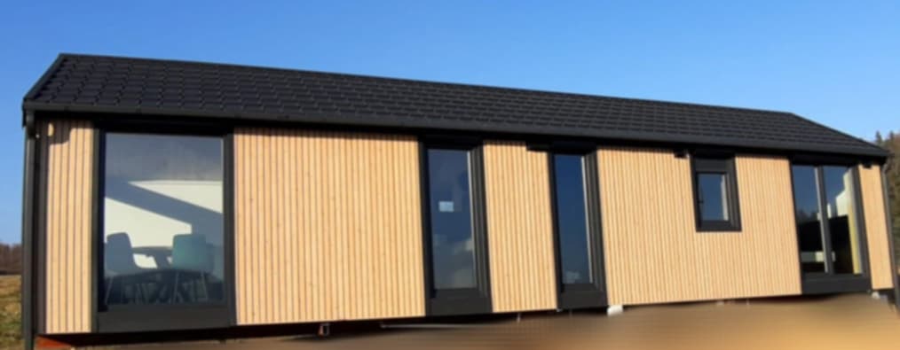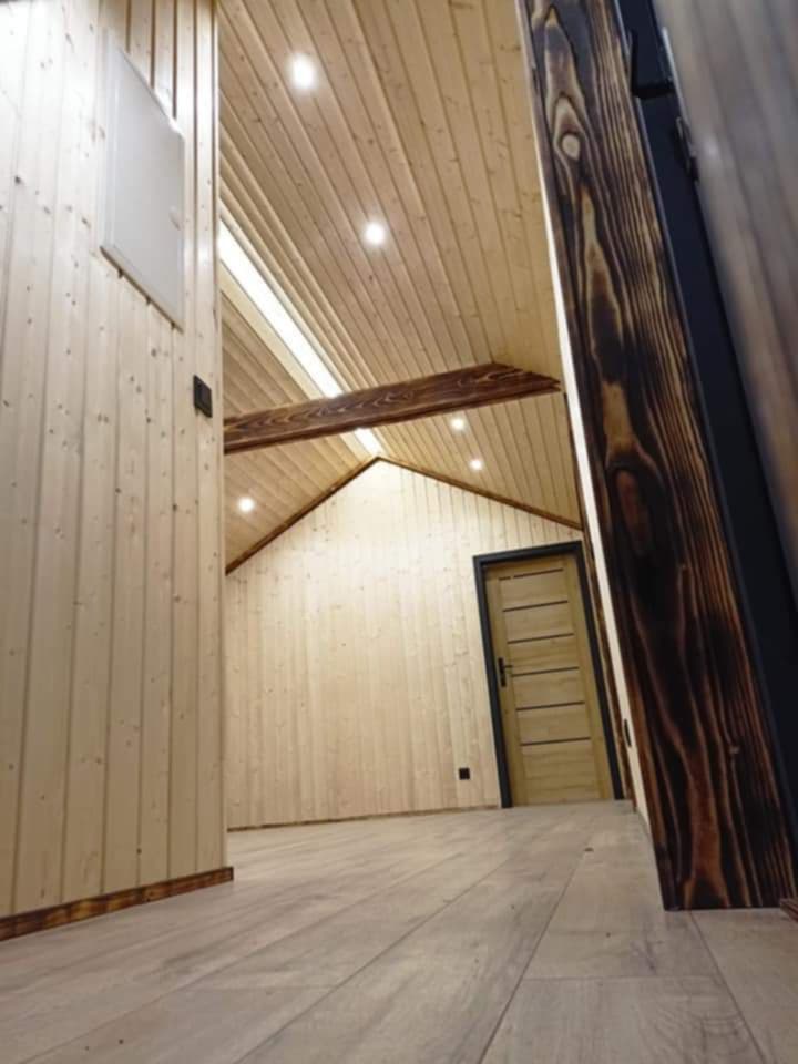 elewacja zewnętrzna drewniana(kompozytowa +70zl), podłoga- panele podłogowe winylowe, ściany i sufity wykończone płytami gk (bez spoinowania), ościeżnice i drzwi, łazienka wykończona płytami fibo, bojler 50l, toaleta, prysznic, umywalkę, szafkę pod umywalkę.