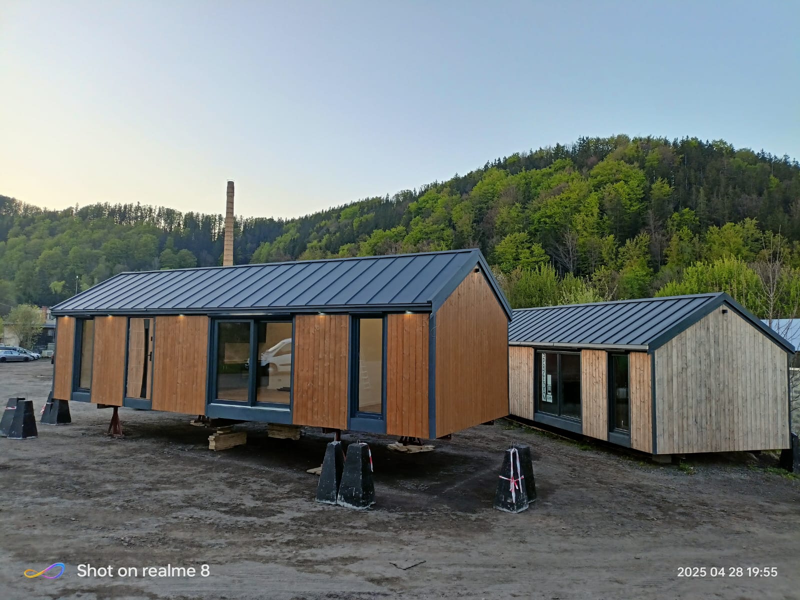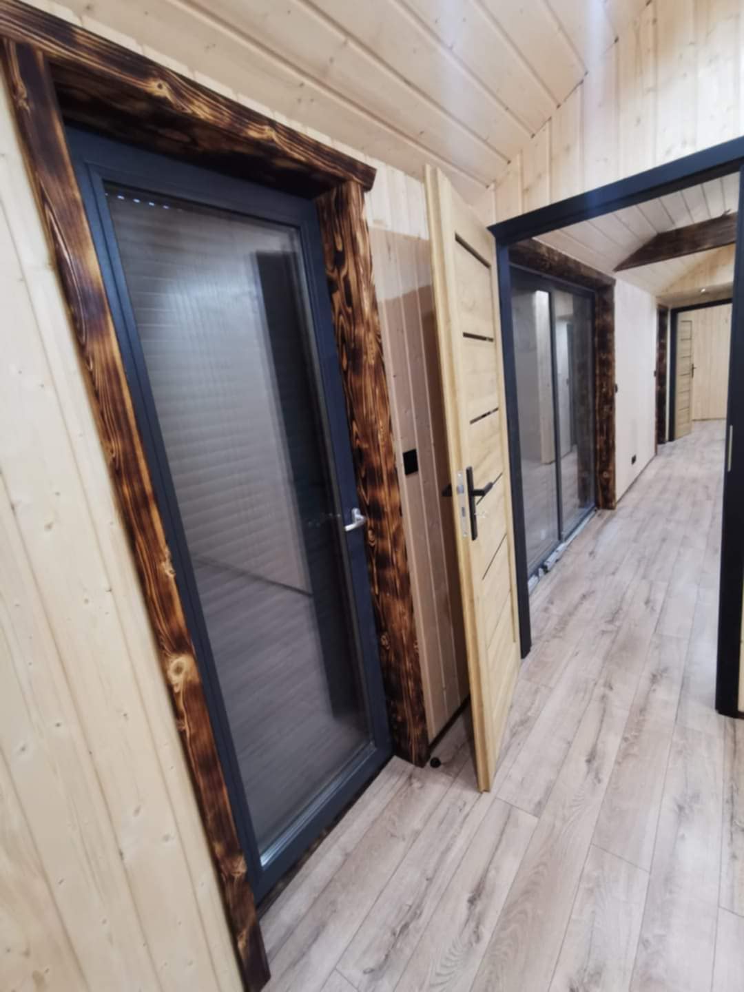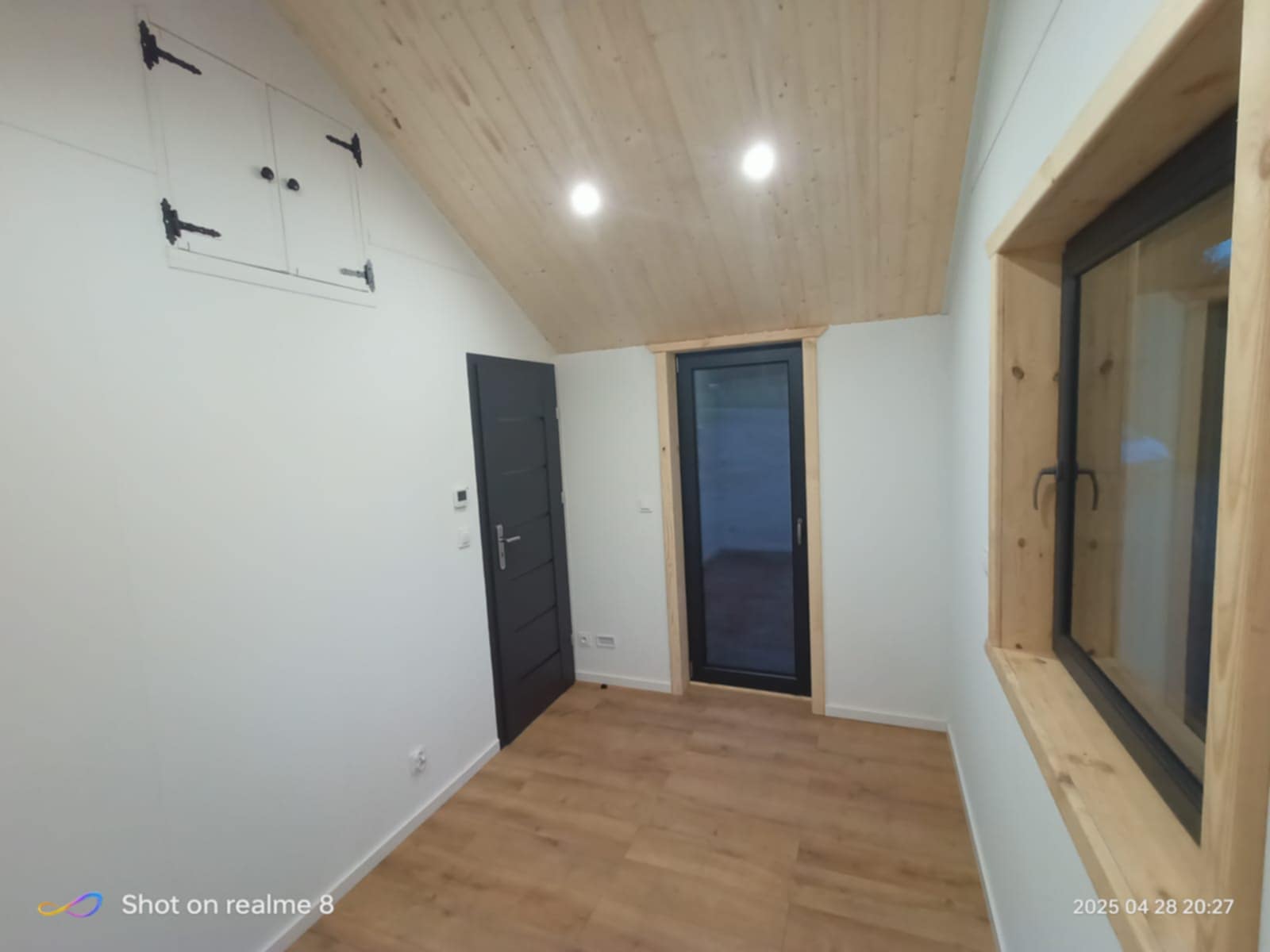 elewacja zewnętrzna drewniana(kompozytowa +70zl), podłoga- panele podłogowe winylowe, ściany i sufity wykończone płytami gk (bez spoinowania), ościeżnice i drzwi, łazienka wykończona płytami fibo, bojler 50l, toaleta, prysznic, umywalkę, szafkę pod umywalkę.